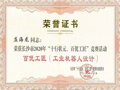 11月28日,长沙市总工会在市会议中心召开长沙市2020年“十行状元、百优工匠”技能竞赛活动总结表彰会。长泰公司人工智能研究部庄海龙、智能装备事业部刘银辉组成的工业机器人设计小组被授予“百优工匠”荣誉称号!